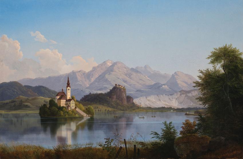 Bled, ki je s cerkvijo na otoku, termalnimi vrelci in čudovitim razgledom na jezero že od nekdaj privabljal izletnike, med njimi pogosto tudi Ivana Cankarja, je bil priljubljen motiv za okras meščanskih salonov. Turistična veduta zajema značilen pogled na otoček in gore v ozadju na lep sončen dan. O čarobnem nastanku Blejskega jezera govori stara ljudska pripoved. Ovce brezbrižnih pastirjev so popasle travo okoli skalnatega hribčka, na katerem so v mesečini plesale . Te so v jezi z okoliških gora priklicale hudournike, ki so poplavili pašnik, in nastalo je jezero z otočkom, na katerem so poslej imele mir.