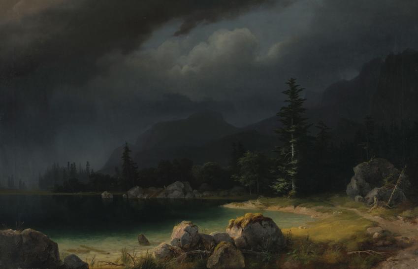 Romantične slikarje krajinarje so privlačile podobe mogočne narave, ki jo mora človek občudovati in spoštovati. Pernhart je Klanško jezero upodobil pod nevihtnim nebom. Slikarja je zanimalo predvsem razpoloženje narave. Čeprav se približuje nevihta, se ponekod še vidijo sončni žarki. Z odbleski svetlobe je slikar hkrati po diagonali razdelil in razgibal kompozicijo. Klanško jezero pripada skupini Belopeških jezer, ki ležijo pod goro Mangart, ob med Italijo, Avstrijo in Slovenijo. Jezera so do konca prve svetovne vojne ležala na Kranjskem, potem pa je to ozemlje pripadlo Italiji.